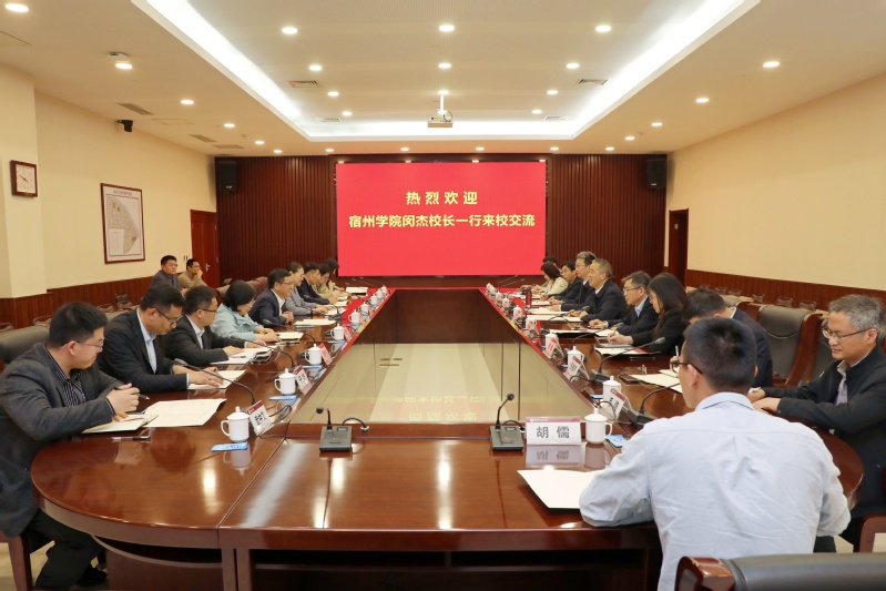 4月10日下午,宿州学院校长闵杰一行来我校调研。校领导张农、姜慧会见闵杰校长一行。双方就硕士学位授予单位及授权点建设、学科建设等工作开展座谈交流。