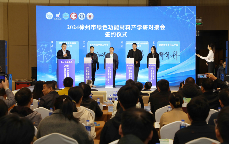10月19日至21日,由徐州市委人才办、徐州市科协联合主办,徐州市化学化工学会、徐州工程学院、中国矿业大学、江苏师范大学共同承办的—“2024徐州市绿色功能材料产学研对接会”在徐州举办。中国工程院院士、江南大学金征宇教授,江苏省科协二级巡视员李政,我校校长张农、副校长谭文轶,教育部“长江学者”特聘教授、山东大学郝京诚,俄罗斯工程院外籍院士、山东省农业科学院彭立增,欧洲自然科学院院士、国家能源集团首席专家王圣,徐州市科协党组书记、主席杜海鹏,副主席宋恒等专家学者出席对接会。相关领域的20余家企业、在徐高校师生等约150余人参加了大会。杜海鹏主持对接会开幕式和签约仪式。